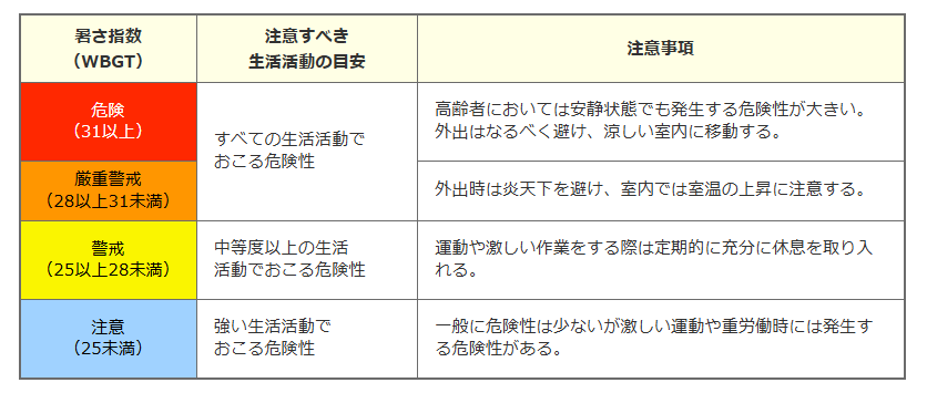 1954年にアメリカで提案された熱中症予防の指数で、正式名称をWet Bulb Globe Temperatureといいます。人体と外気の熱のやり取りに注目し、①湿度、②日射や輻射などの周囲の熱環境、③気温の3つを統合して算出されます。気温(℃)と区別しやすいように、単位のない指標で表記されています。