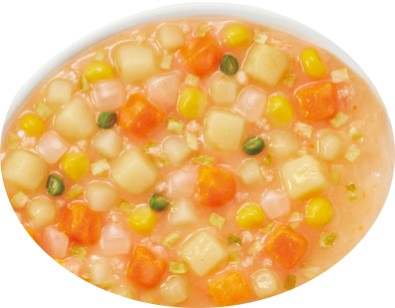 例えば、魚を使ったメニューでは、幼児向けにはゴロっとした存在感のある魚の切り身が入っていますが、ベビー向けでは、魚は細かく刻まれています。このように、プレキッズフードでは具材のかたさや大きさ、形状をステップアップしています。