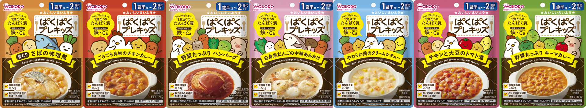 「ぱくぱくプレキッズ」はベビーフードを卒業した1歳半頃から2歳代のお子さまに向けた手軽においしく栄養が摂れる幼児食「プレキッズフード」です。ラインアップは全7アイテム。肉・魚・大豆などのたんぱく食材や、野菜をたっぷり使った豊富なメニュー展開です。ごはん(80g)と一緒に食べると、1食分※のたんぱく質、幼児期に不足しがちな鉄・カルシウムが摂れるように設計されています。また、お子さまの発達に配慮した設計にしながらも、見た目のおいしさにもこだわり、より嗜好性をアップした風味に仕上げました。