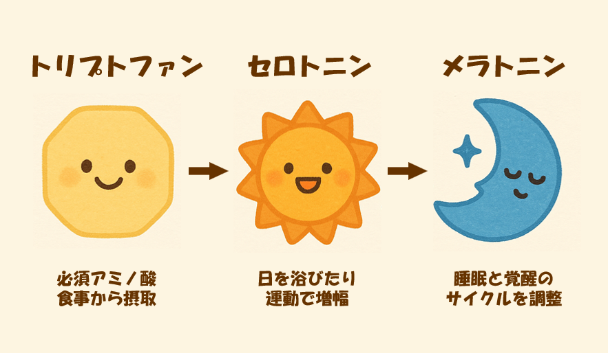 眠気を引き起こすホルモン「メラトニン」は、体内で時間をかけて作られます。その出発点となるのが「トリプトファン」というアミノ酸で、たんぱく質を多く含む食材に含まれていています。トリプトファンは、体内で複数のビタミンやミネラルが関わりながら、「セロトニン」というホルモンに変わり、「メラトニン」へと変化します。