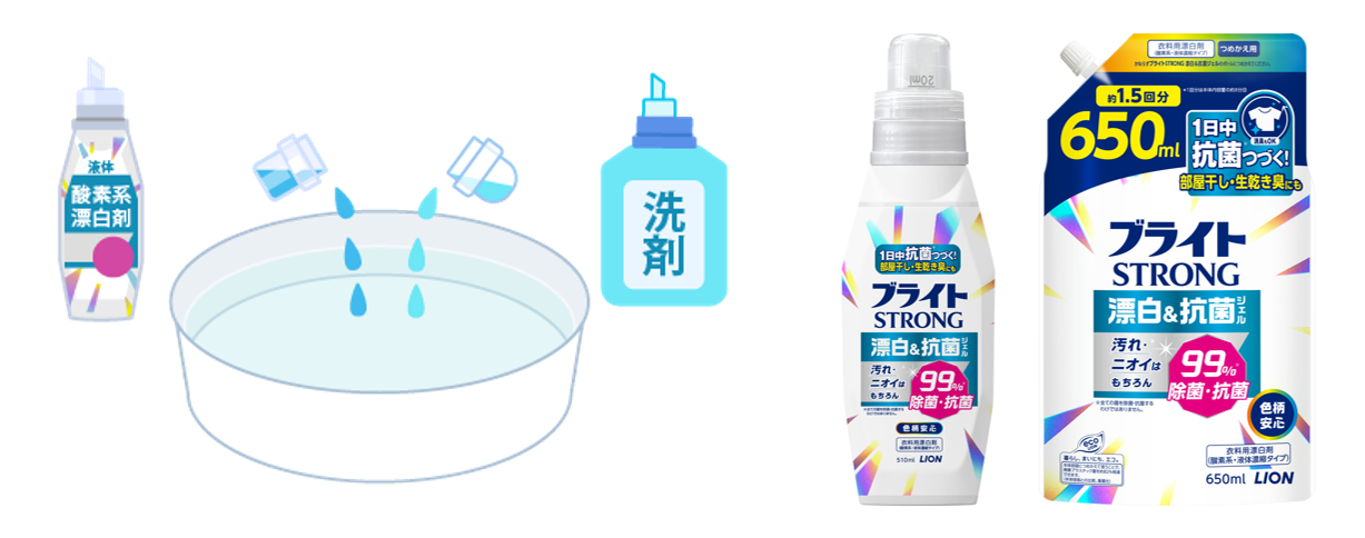 ぬるま湯約5L+ ブライト STORONG漂白&抗菌ジェル50ml+液体洗剤(キャップで水30Lの線まで)