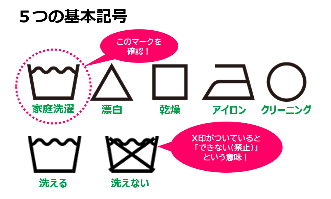 まずは家で洗えるのか、分からない場合は、必ず洗濯表示を確認しましょう。家庭で洗えるかどうかを見極め、洗えないものはクリーニングへ。洗えるものは、表示に従って適切な洗い方を選んでください。よく聞く失敗例は、標準コースでセーターを洗って縮ませてしまうこと。お気に入りの衣類を長く使うためにも、お洗濯前の表示確認は忘れずに。