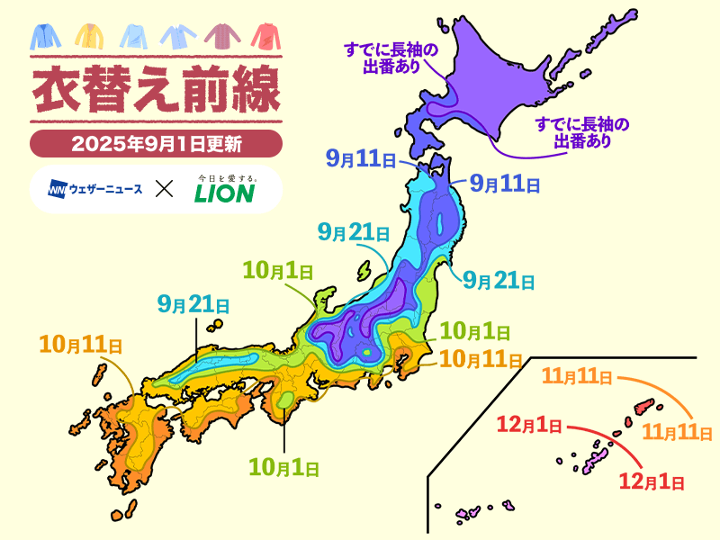 ライオンとウエザーニュースの共同調査によると、夏の終わりに、長袖を着始めるタイミングは「最低気温」が大きく関係していることが分かりました。最低気温が20度を下回ると約5割の人が、18度を下回ると約6割が長袖を着用し始めます。2025年の衣替え前線を見てみると、同じ東京都内でも地域によって、ずいぶんとタイミングに差がありますね。