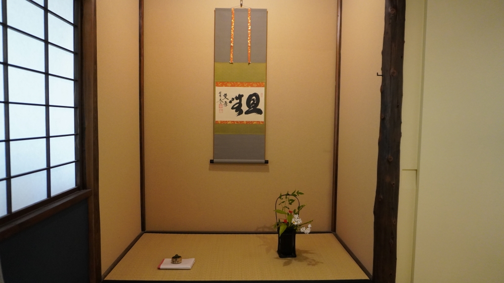 また、季節の花もさりげなく生けられていました。これは、訪れる人へのおもてなしの心や、自然の美しさを大切にする茶道の精神を表しています。そして茶室には、ほのかにお香が焚かれていました。掛け軸・花・お香。それぞれが主張しすぎることなく、茶室全体の調和をつくり出しています。