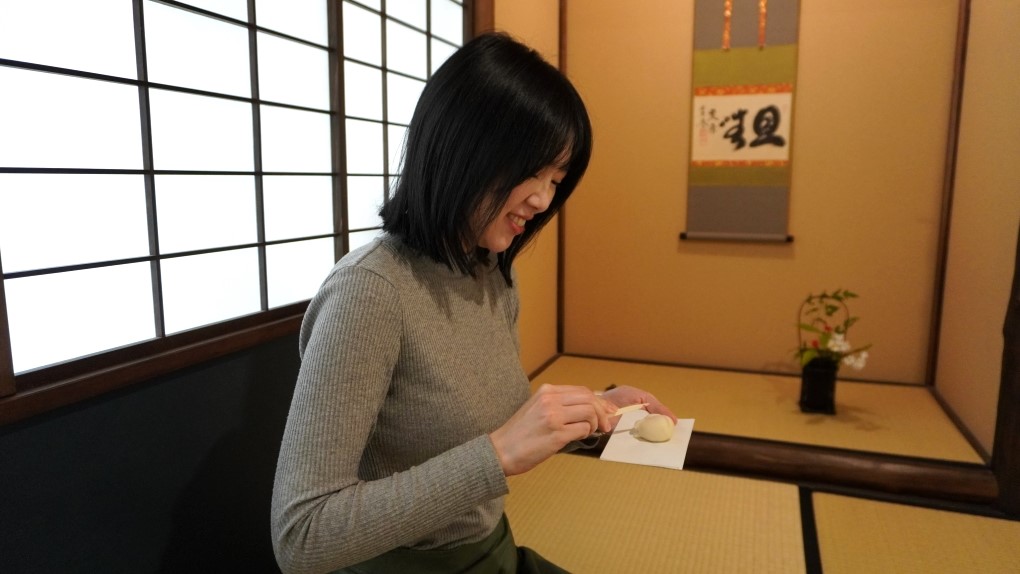 黒文字という小さな木の楊枝で一口大に切り分け、お抹茶が点てられる前にいただきます。口に入れると、やさしい甘さが広がります。