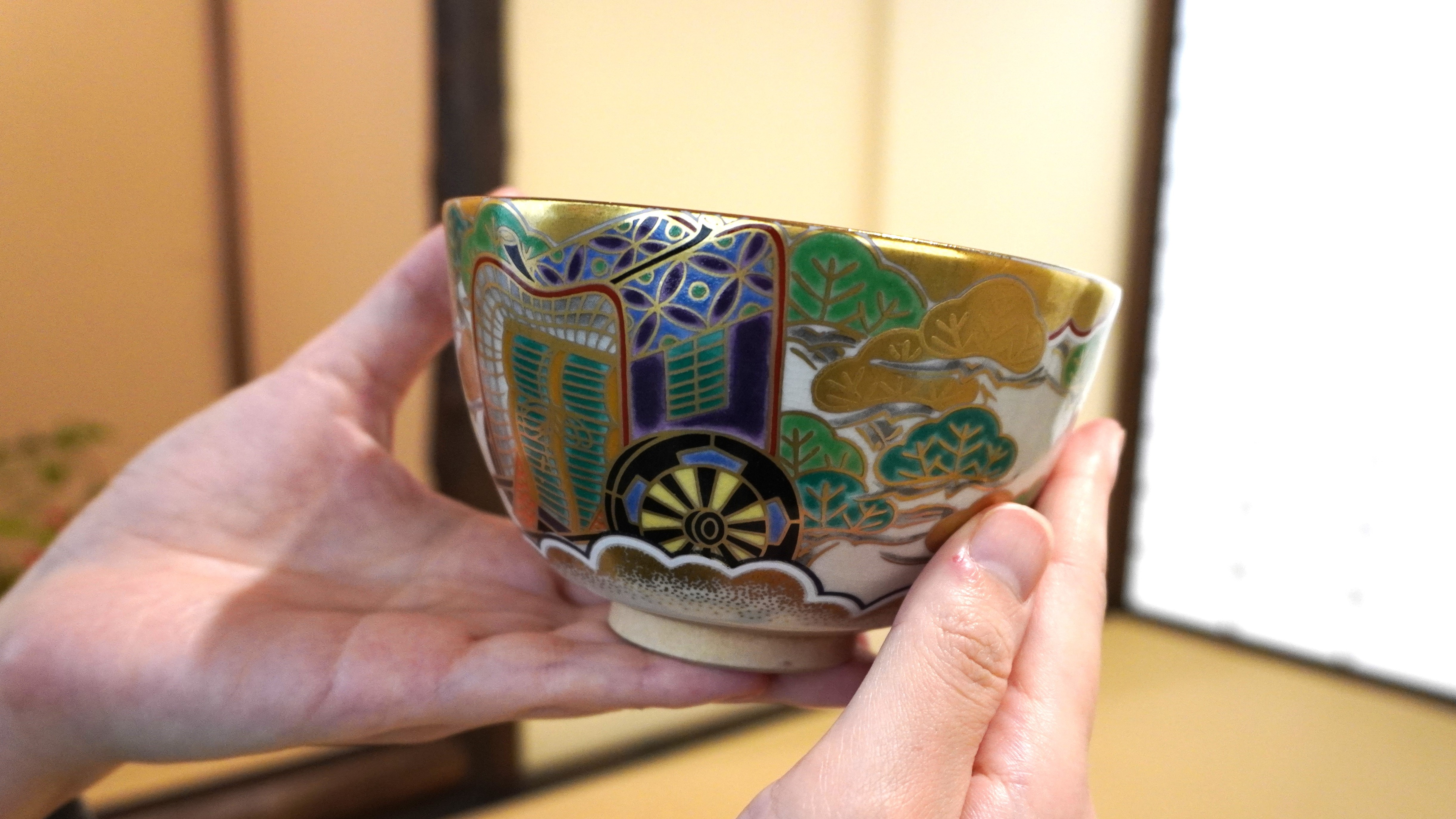 この日の茶碗は、新年にあわせて金色に松があしらわれた華やかなもの。