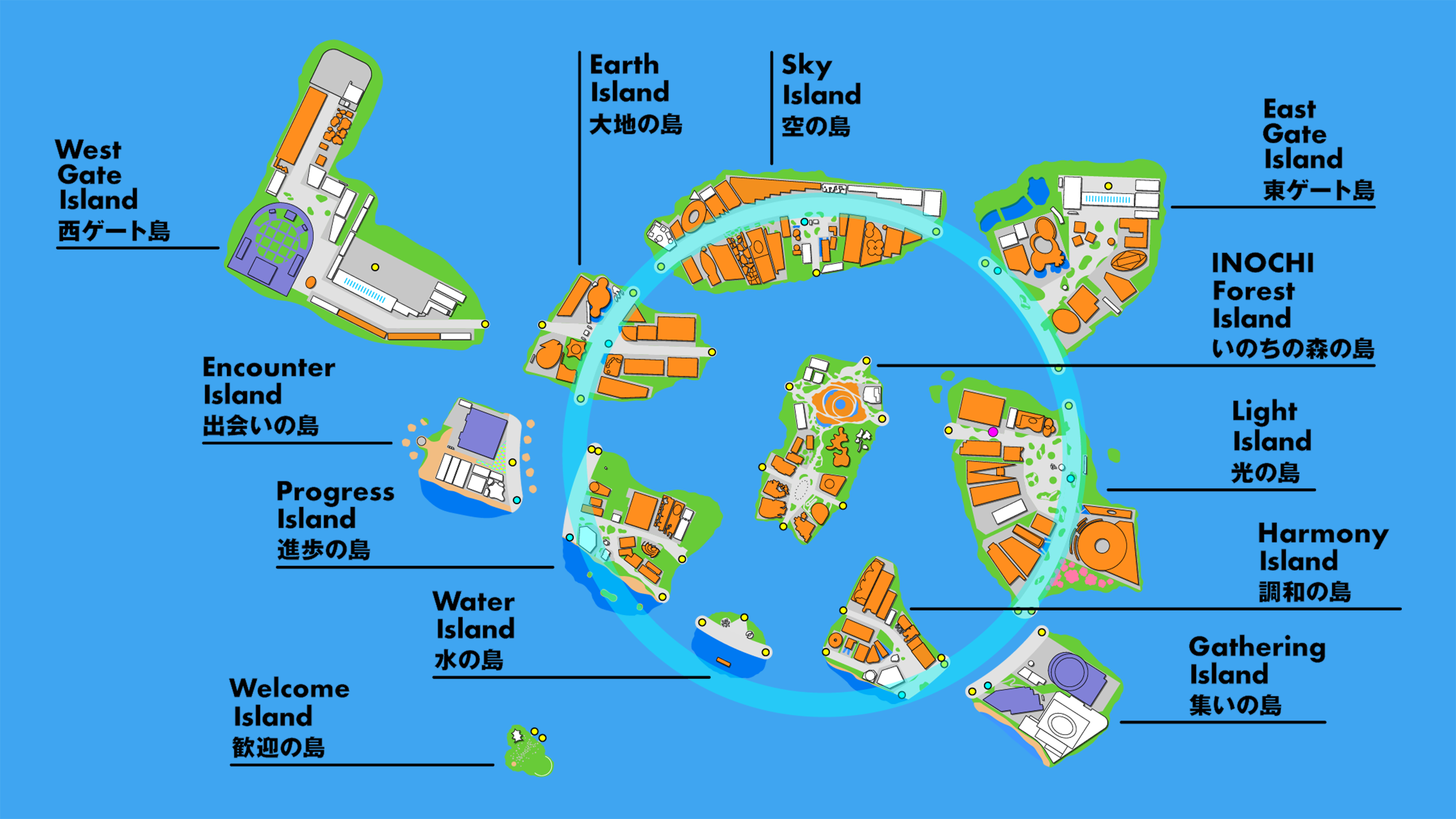 バーチャル会場のコンセプトは、「空飛ぶ夢洲」。「多様でありながら、ひとつ」であることを島国である日本になぞらえ、12の群島で構成されています。