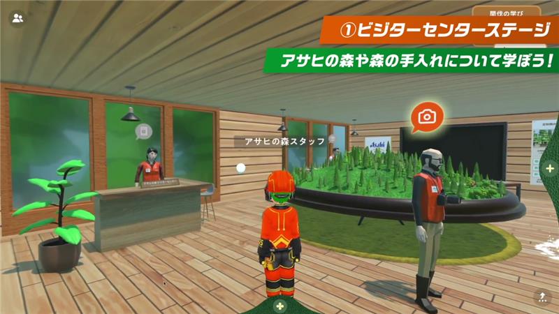 豊かな森は私たちに必要不可欠な食資源や水源を供給しています。健全な森の管理が私たちの生活にどのように影響するのか、ゲームや森の管理者とのやり取りを通じて、森林保全活動を体感できます。体験の最後にはアサヒの森スタッフや参加しているアバター同士で、振り返りやバーチャル乾杯を楽しめる演出も用意しています。