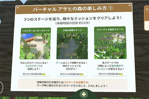 「バーチャル アサヒの森」は3つのステージで構成されています。体験時間の目安は約15分。3つのステージを巡り、さまざまなミッションをクリアしましょう。