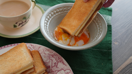 卵にカヤジャムとバターを挟んだトーストをつけて召し上がれ。
