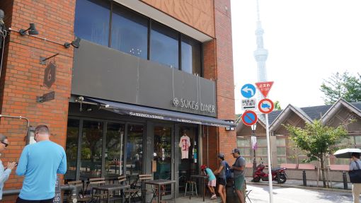浅草駅から隅田川沿いを歩くと見えてくる、レンガ造りの建物が「SUKE6 DINER(スケロクダイナー)」です。浅草の街に、海外風のおしゃれな外観が印象的です。オープン前から外国人観光客が並ぶことも多い人気店です。