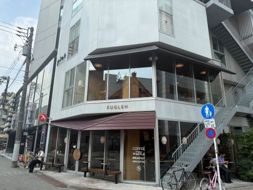浅草寺近くの浅草西参道商店街を抜けた先に、おしゃれな外観が際立つカフェ「Fuglen Asakusa(フグレン アサクサ)」があります。大きなガラス張りの窓がお店を囲い、明るく開放的な雰囲気です。