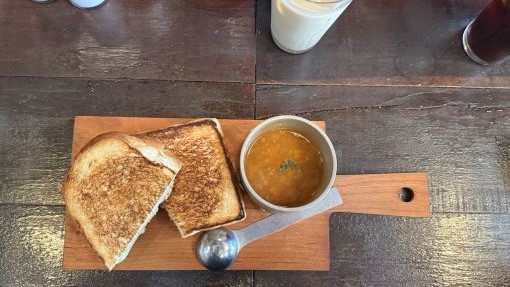 サクッと食感のトーストに、とろけたチーズとツナが相性抜群。チリスープは昔からオリジナルで作っているレシピとのこと。ソイミートを使っているので、重すぎず朝食にぴったりです。