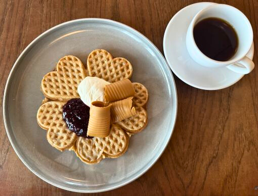 トッピングには、ブラウンチーズのほか、サワークリームと自家製のベリージャムが添えられています。ほのかに甘くコクがあるブラウンチーズと、甘酸っぱいジャムが相性ぴったり!ワッフルは、中がもちっとしていながらも薄い生地なので重くなく、ぺろりと完食してしまいました。